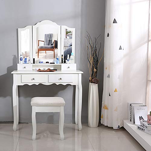 Yifa Coiffeuse MDF Tabouret-Blanc avec 4 Tiroirs et 3 Miroir...