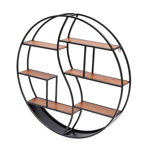 Étagère ronde industrielle noire en bois et métal, élégante.