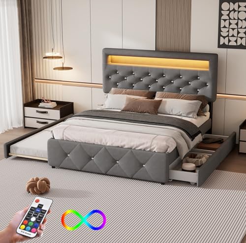 Lit 140x200 avec sommier à Lattes et chevet LED,lit Coffre 1...