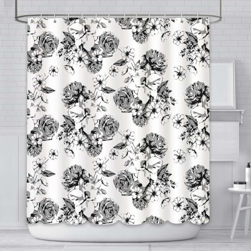 Rideau de douche botanique vintage fleurs noir blanc 180x180...