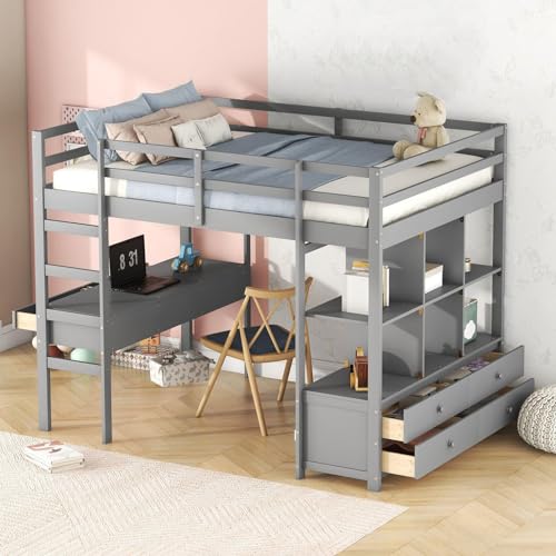 KOMHTOM Lit Mezzanine Lit Double avec Tiroirs de Rangement e...