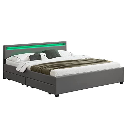 Juskys Lit Lyon confortable Coffre LED sommier Lattes Simili...