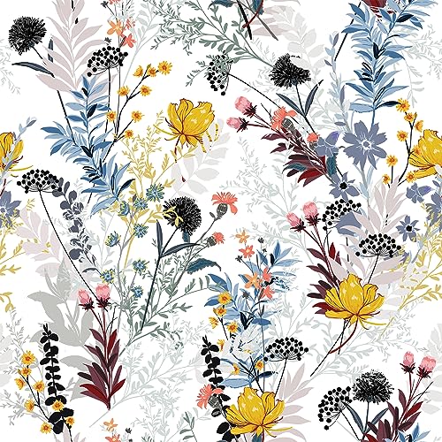 Papier peint feuillage bleu fleurs blanc adhésif meuble sall...