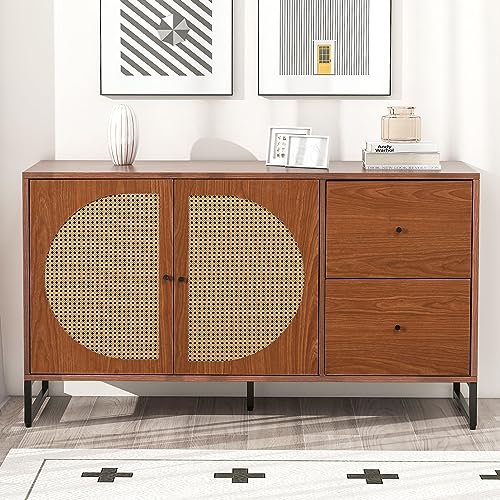 Buffet rotin, tiroirs, porte métal, armoire autonome