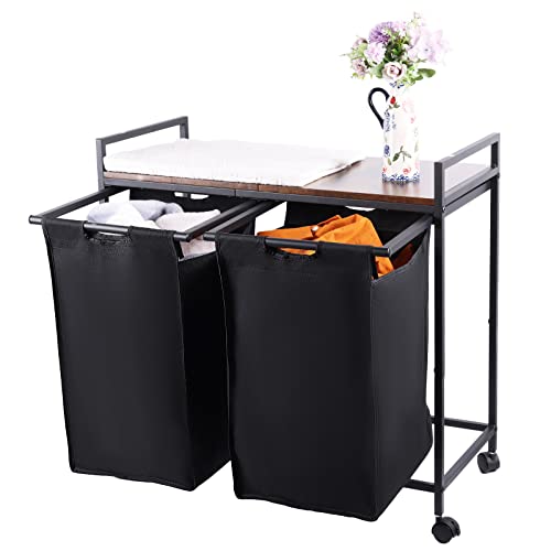 Panier linge rustique roulettes trieur 2 sacs amovibles étag...