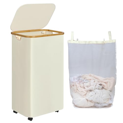 Panier à linge 110L Bambou avec roues et couvercle, corbeill...