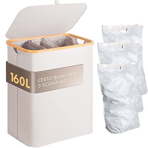 Panier à linge bambou 3 compartiments 160L trieur de vêtemen...
