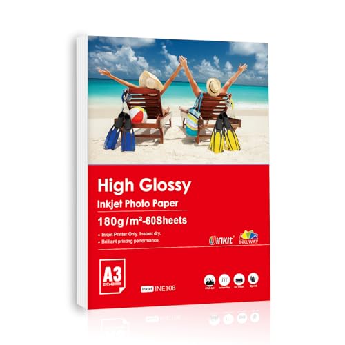Inkway 60 feuilles A3 Papier photo brillant Premium 180g/m²...