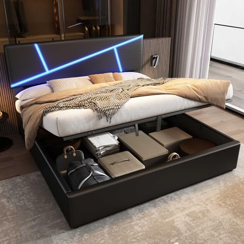 KOMHTOM Coffre Lit LED Rembourré Hydraulique Plateforme Latt...