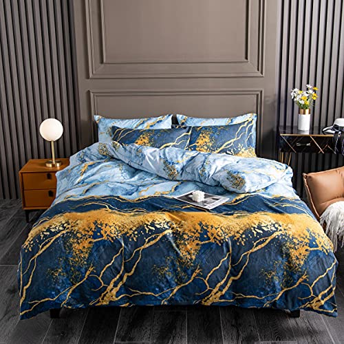 Parure de lit géométrique microfibre bleu blanc doré King Si...