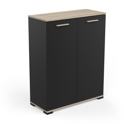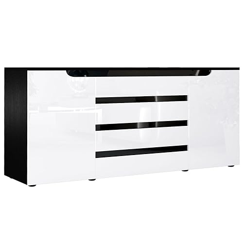 Vladon Buffet Sylt V2 Noir Mat Façades Blanc Haute Brillance