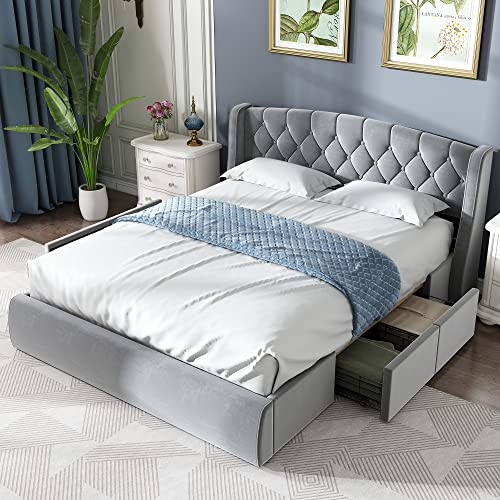 Lit velours rembourré, 140 x 200 cm, tiroirs 4, gris, élégan...
