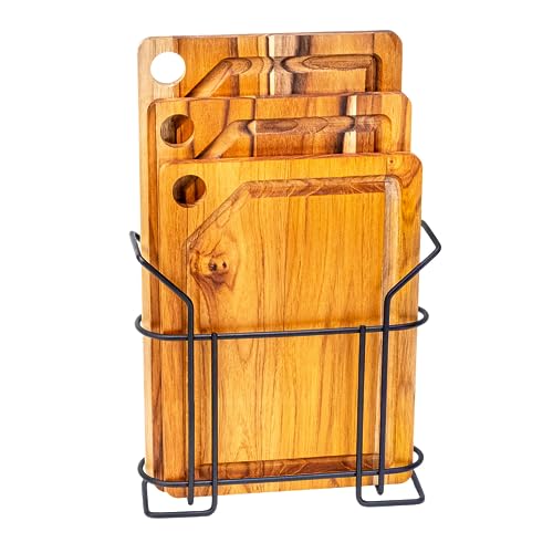 Set de 3 planches à découper en bois teck, réversibles, diff...