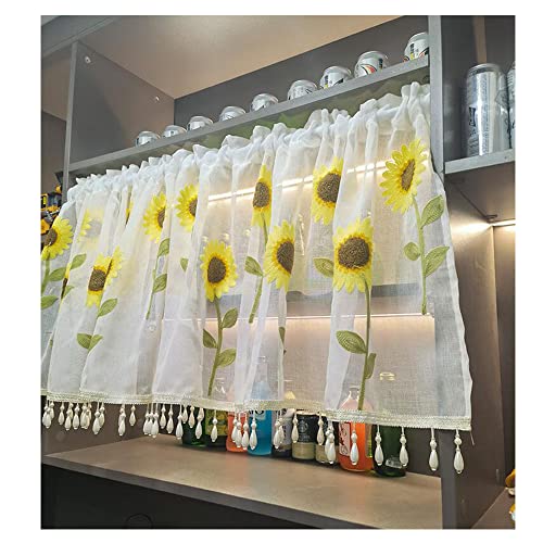 Tournesol demi-rideaux brodé, franges perles, passe-tringle...