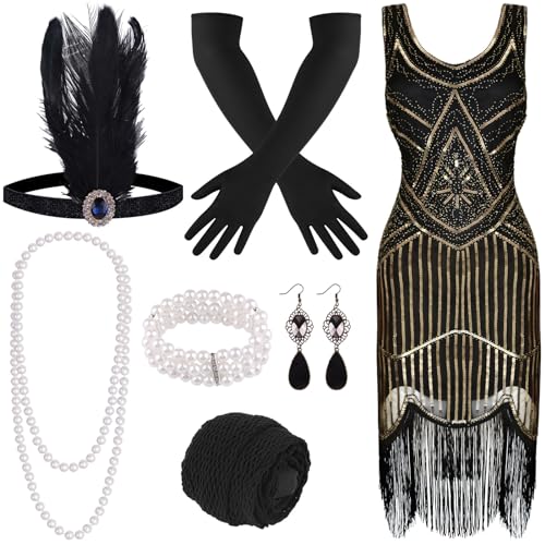 FEPITO Robe des années 1920 à col en V et sequins à franges...