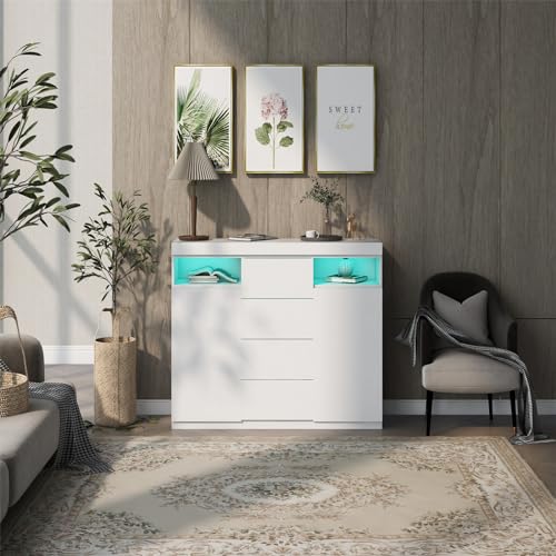 Buffet LED Moderne, Meuble De Rangement Blanc Brillant, Syst...