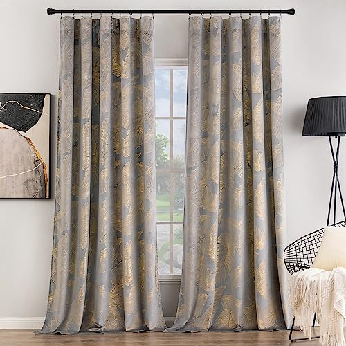 Rideaux Velours Feuilles d'Or Doux, 2X Gris, Double Rideau O...