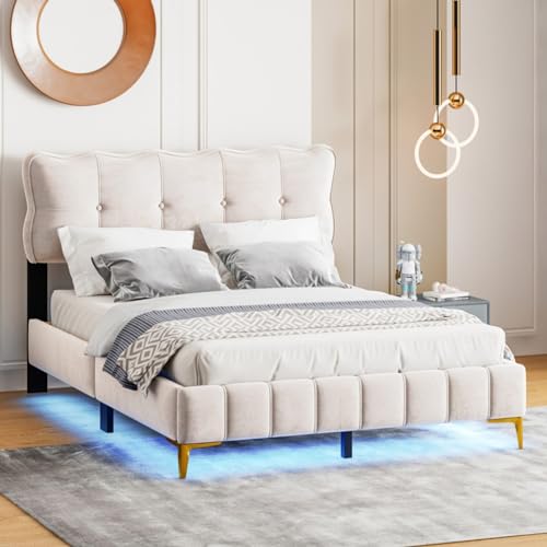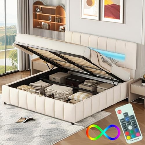 Lit rembourré 180x200cm, Cadre LED métal, Rangement, Beige