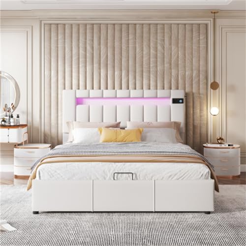 Merax Lit 140x200 cm LED, rembourré, tiroirs 4, tête réglabl...