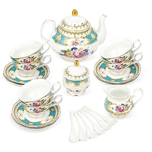 Fanquare 21 Pièces Service Thé Bleu Vintage, Service Café Fl...