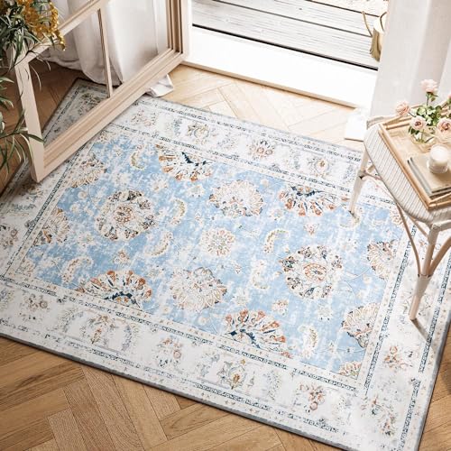 Tapis persan bleu 60x90 cm - Imprimé floral - Vintage fin pl...