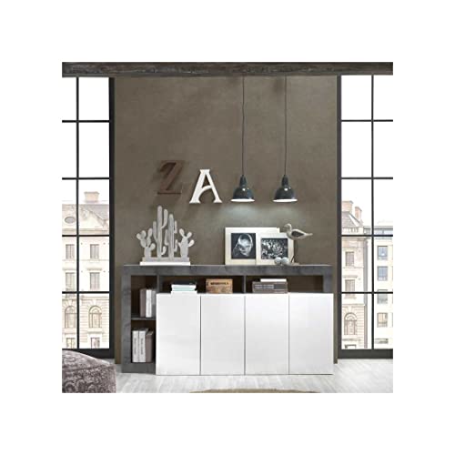 Buffet 4 portes Blanc laqué brillant/Béton ciré foncé Ischia...