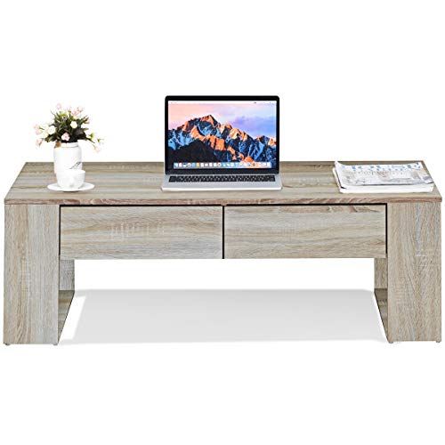 GOPLUS Table Basse, 2 Grands Tiroirs & 2 Étagères, Bois Chên...