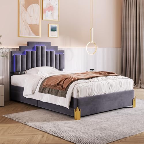 Merax Lit 140 x 200 cm avec LED, lit rembourré, avec 4 tiroi...