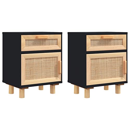 XL Tables de Chevet Noir Bois Massif et Rotin Naturel 2X