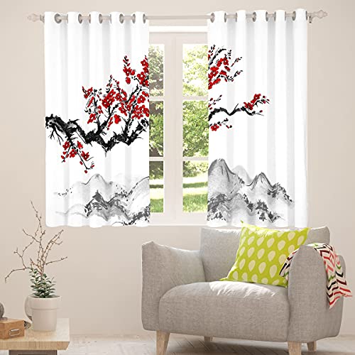 Rideaux Fleurs Cerisier Rouge Montagne Panneau Noir Blanc