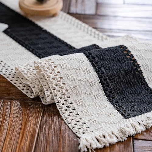Boho Chemin de Table Rustique Beige et Noir Coton Tissé