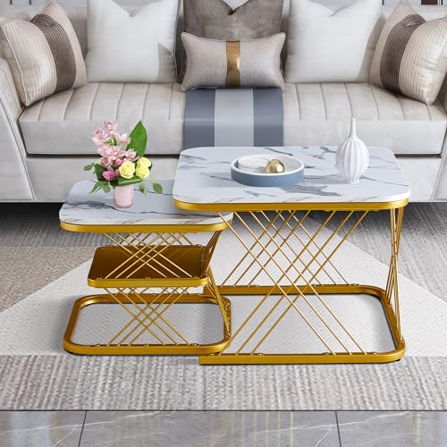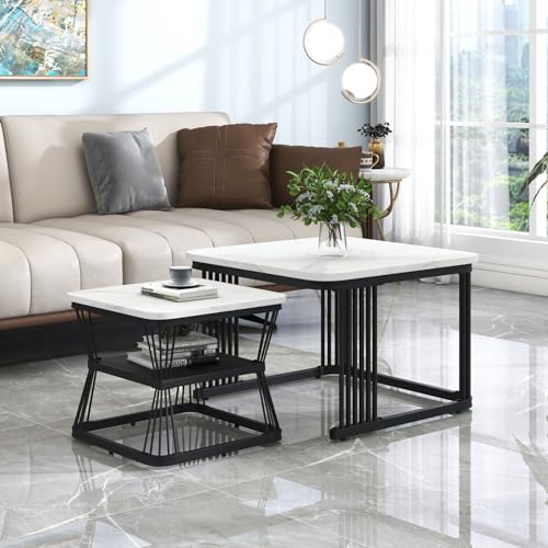 Lot de 2 tables basses, Table d'appoint carrée, plateau marb...