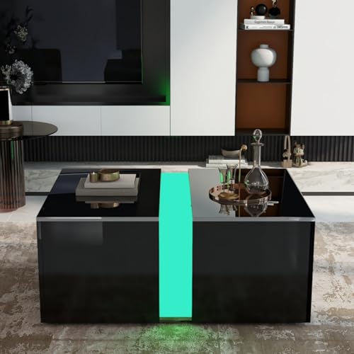KOMHTOM Table basse LED noire avec étagère cachée pour salon...