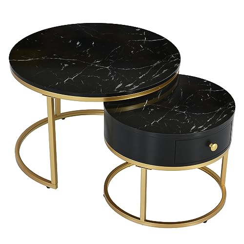 Lot de 2 tables basses rondes marbre avec tiroir et rangemen...