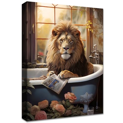 Lion dans la baignoire Cadre en bois Impression sur toile Ma...