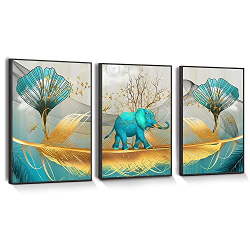 hyidecorart Cadre Noir Éléphant Doré Plume Turquoise Tableau...