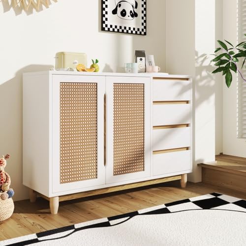 Buffet Sweiko Faux rotin, Sideboard tiroirs et étagères régl...