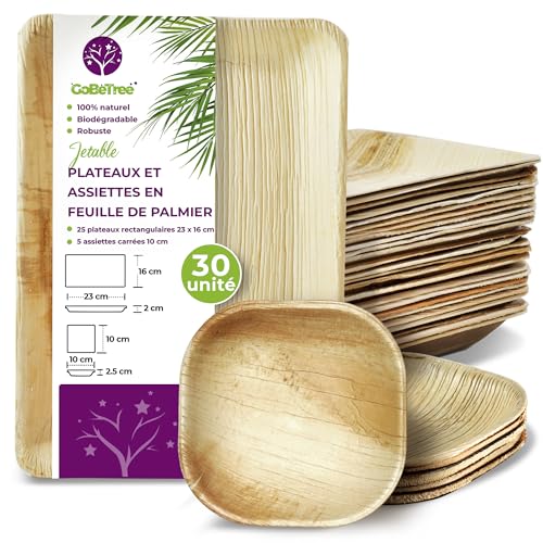 30 plateaux jetables en feuille de palmier, 25 plateaux rect...