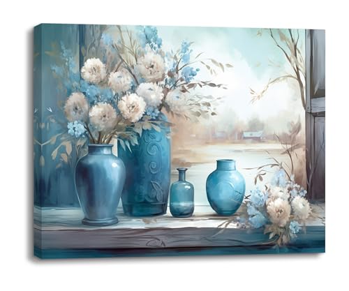 Impression Toile Bleue Fleurs Vase Décoration Murale Art Déc...