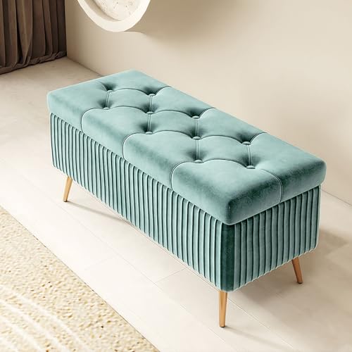 Banc ottoman de rangement moderne en velours bleu avec base...
