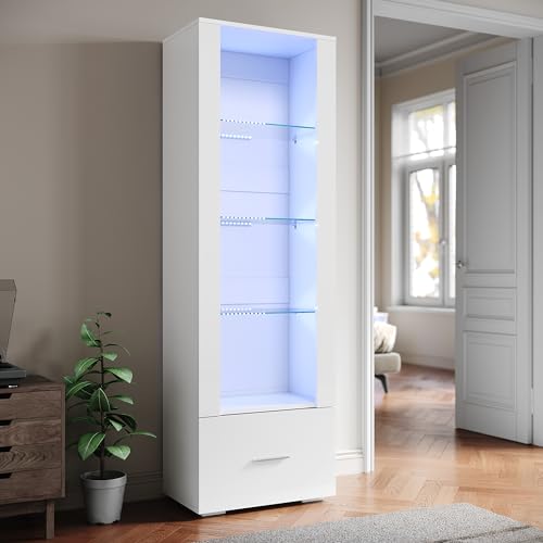 Vitrine blanche LED étroite, vitrine buffet avec étagères ve...
