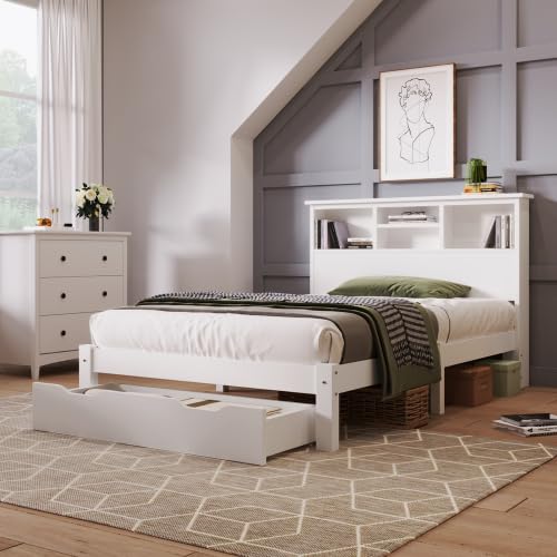 Lit Simple Rangement Boisé Cadre Simple Étagères Blanc Tiroi...